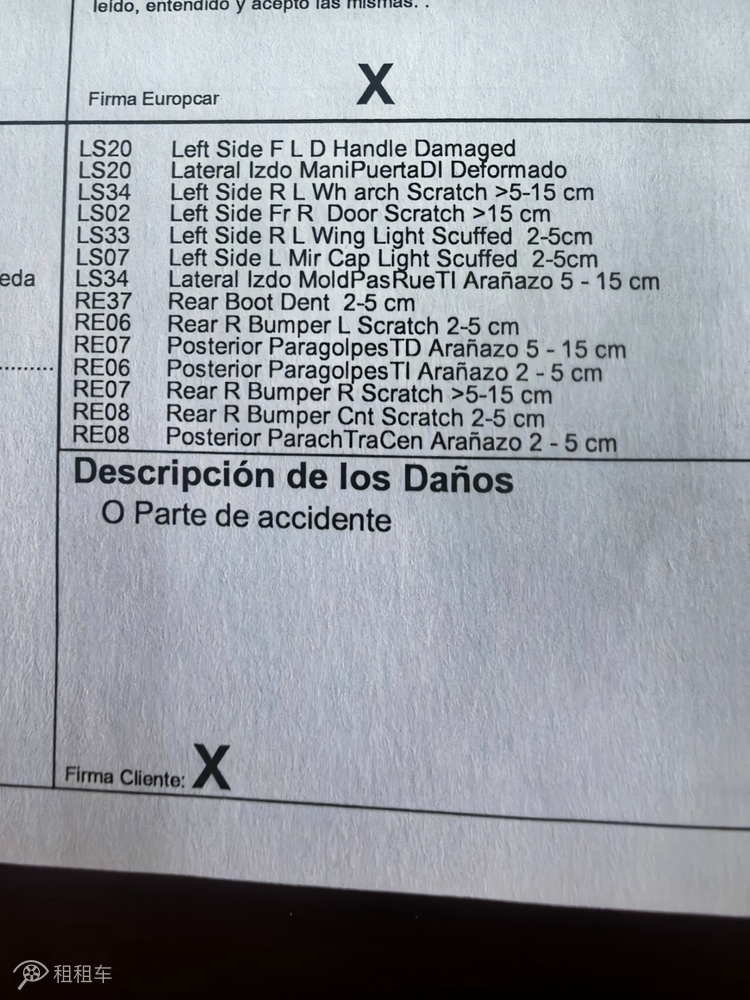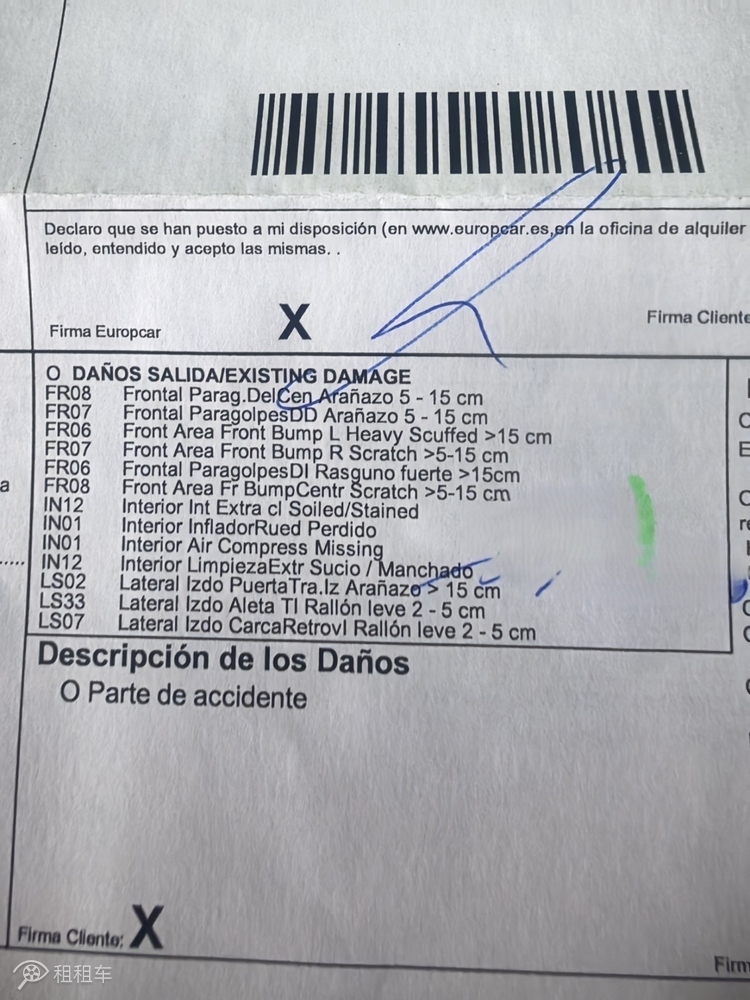 我租的是一臺(tái)起亞獅跑,22天,柜臺(tái)工作人員先是忽悠我再花500歐元升級(jí)為奧迪Q5,被我拒絕后,扔給我一臺(tái)福特翼虎。作為一位去過50 國(guó)家的資深自駕游愛好者,這臺(tái)翼虎車身上的剮蹭痕跡和破損之處,絕對(duì)是我遇到過的WORST CASE,沒有之一,僅租車合同上載明的就有27處之多(附圖01和附圖02),而且車子專門停在一個(gè)光線很差的車位上。試想:如果按照租車合同一處一處核對(duì),豈不是要被玩死?!沒辦法,只能開出機(jī)場(chǎng),到路邊上停好車,拍照取證(附圖03、附圖04)。